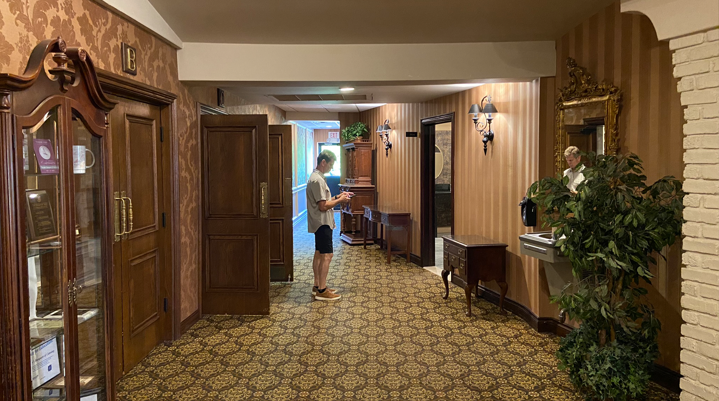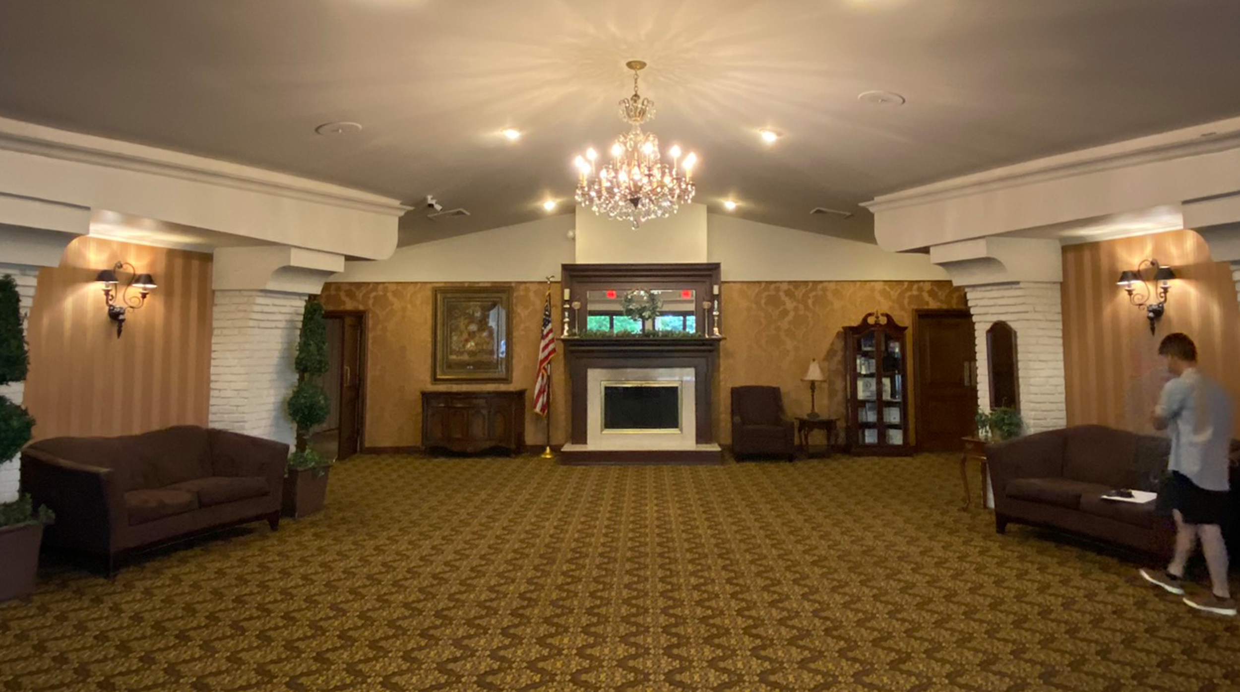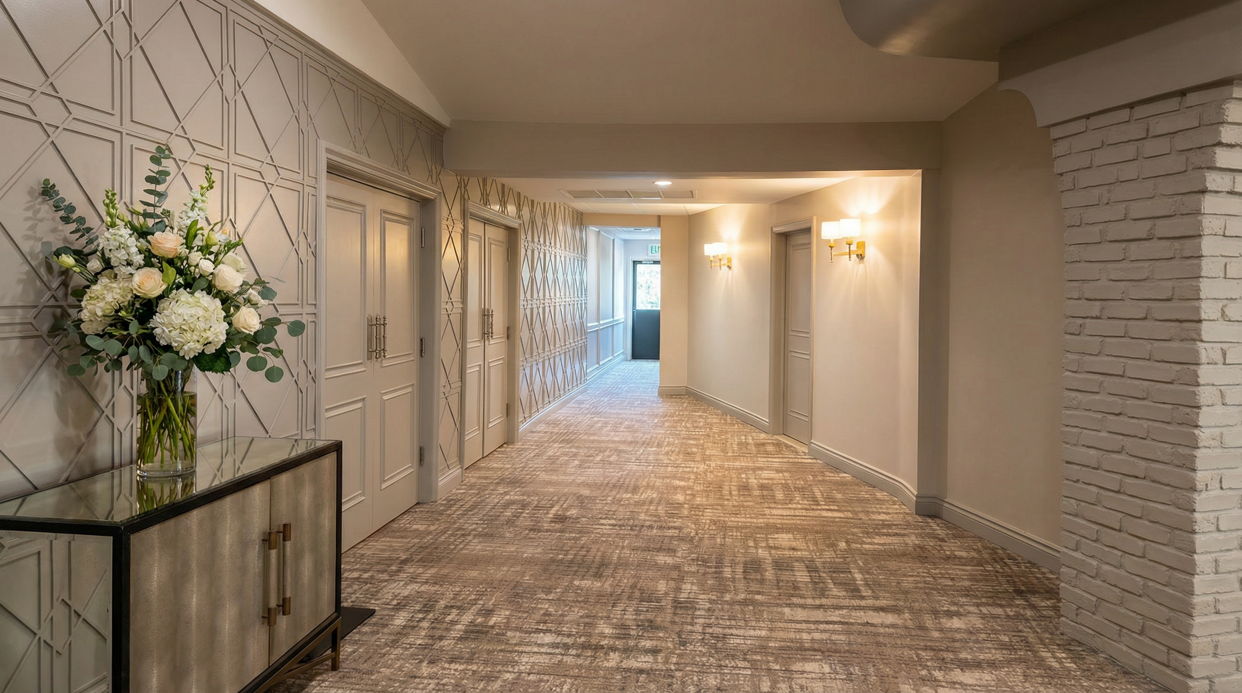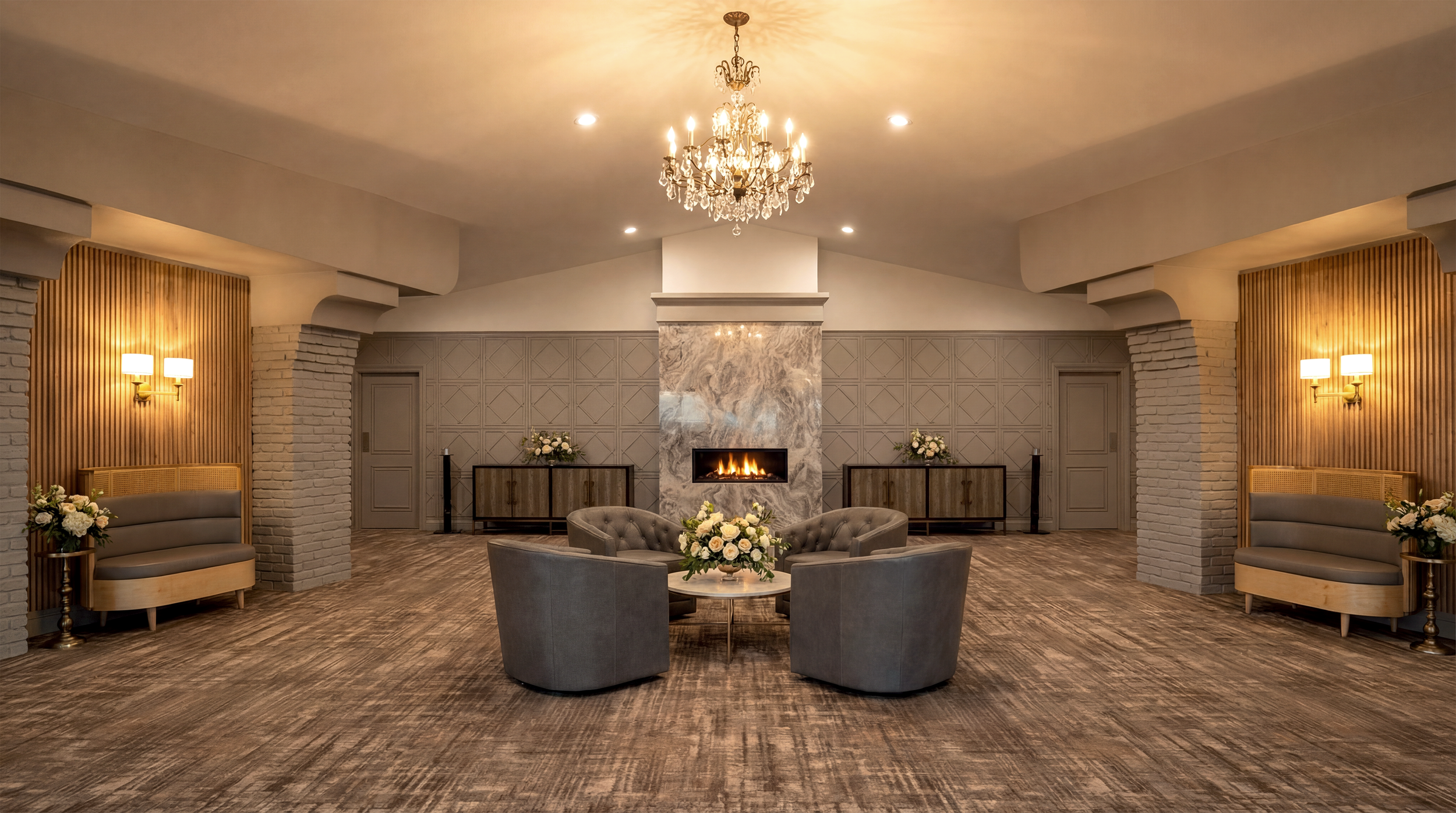 Stepping into this decades-old Italian banquet hall once meant entering a world of heavy dΓ©cor and layered, timeworn details. The design goal was to gently strip back what felt busy while honoring the buildingβs original character. Curved soffits, brick pillars, and the signature chandelier were preserved as architectural touchstones, then paired with new flooring, refined wall colors, quiet wallpapers, and textured installations that introduced a calmer, more contemporary rhythm. A redesigned fireplace, updated lighting, and thoughtful furnishings created soft moments of atmosphere, transforming the lobby into a space that invites guests to settle in rather than pass through.